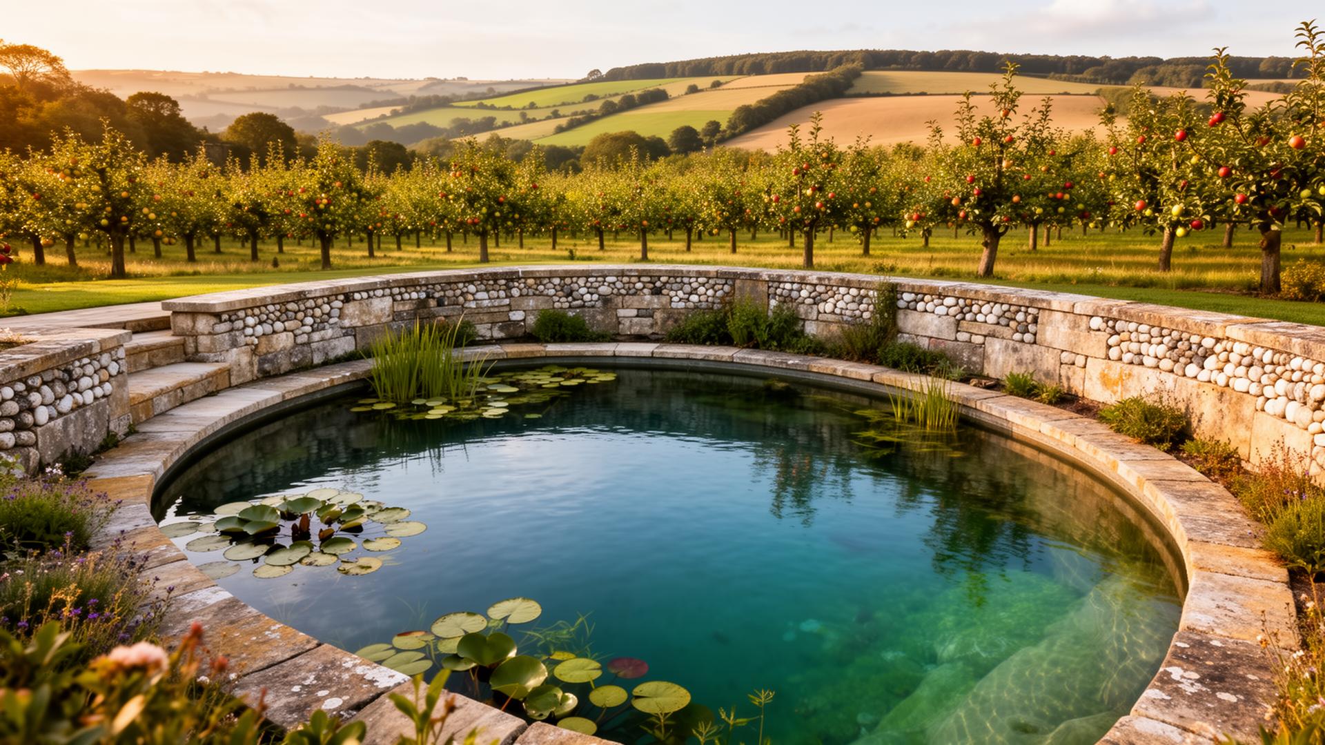 Orchard-framed pools set within the productive landscape that characterises the Malling Valley, with blossom views in spring and fruit trees providing dappled shade in summer